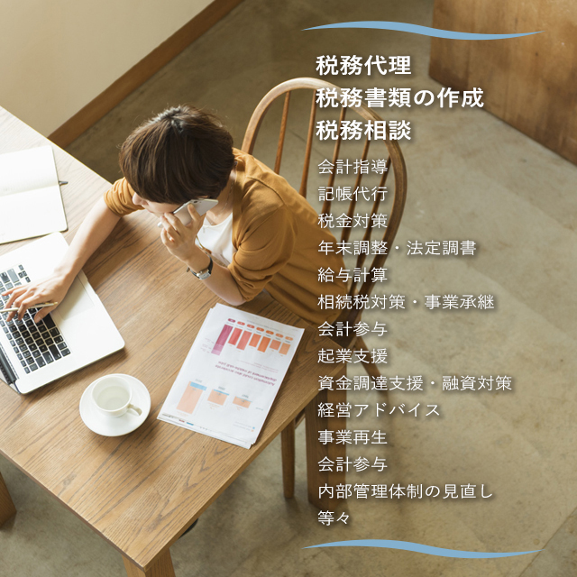 業種、企業形態、規模にかかわらず税理士の重要な業務(税務代理・税務署類の作成・税務相談)をベースに、税金対策のご提案など提供可能な様々なサービスをご用意して各社のニーズにお応えしています。起業・独立支援や小規模経営支援では、通常の税理士業務や会計指導のみならず記帳代行・給与計算、さらに資金調達アドバイスなども含めた経理面をしっかりバックアップ。皆様が本業にご専念いただけるようにお手伝いたします。